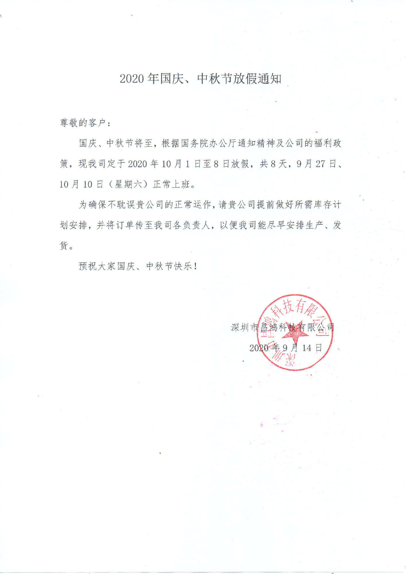 國慶、中秋節將至,根據國務院辦公廳通知精神及公司的福利政策,現我司定于2020年10月1日至8日放假,共8天,9月27日、10月10日(星期六)正常上班。