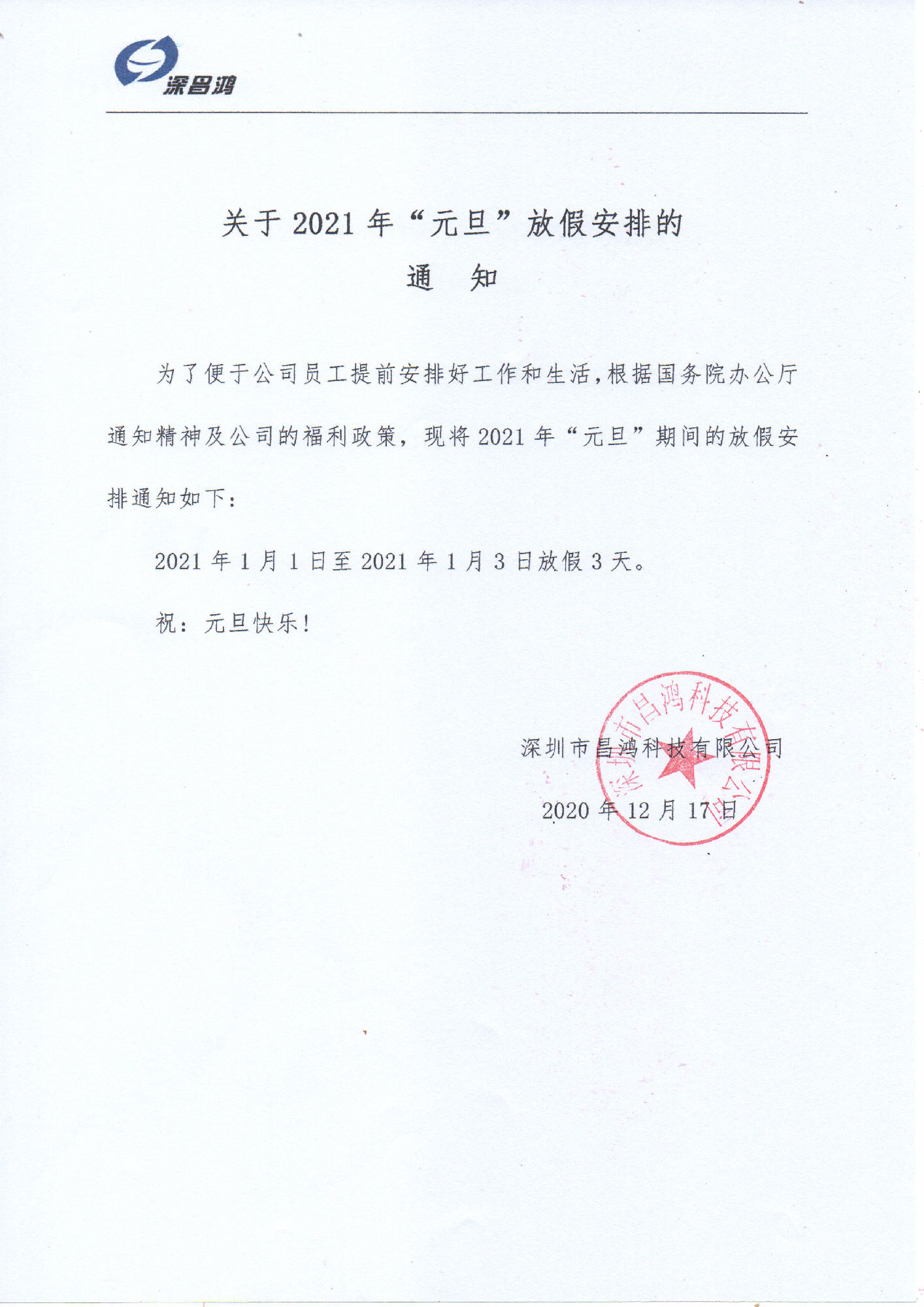 為了便于公司員工提前安排好工作和生活,根據(jù)國(guó)務(wù)院辦公廳通知精神及公司的福利政策,現(xiàn)將2021年“元旦”期間的放假安排通知如下: