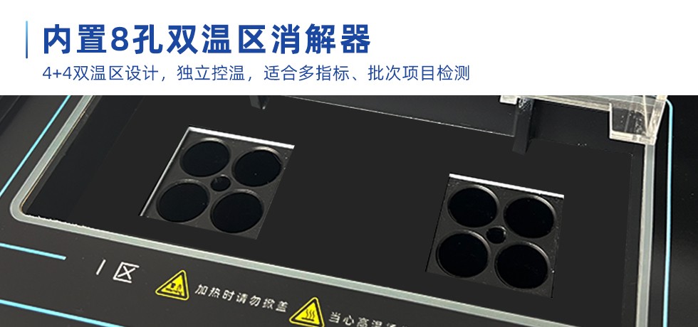 ● 儀器內置8孔雙溫區消解器,4+4雙溫區設計,獨立控溫,適合多指標、批次項目檢測;
