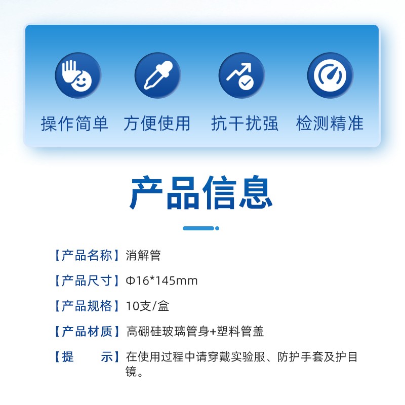深昌鴻消解管(16mm*145mm)適用于COD、總磷、總鉻消解,透明、方便、美觀、配合牢固、使用效率高。【適用領域】