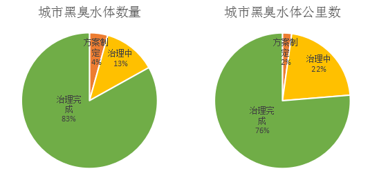 對比兩張圖發現,處于治理中的黑臭水體數量占總數量的比重為13%,而處于治理中的黑臭水體公里數占總公里數的比重為22%,上升了9%。