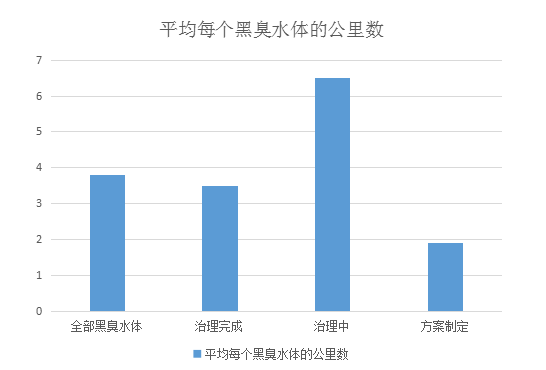 由此,我們對比了治理中、治理完成、方案制定和總的黑臭水體的平均每個的公里數,即下圖: