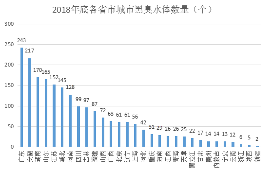 由圖可知,廣東、安徽位于各省市城市黑臭水體數量的*梯隊,都超過了200個;湖南、山東、江蘇、湖北、河南位于第二梯隊,超過了100個;四川、吉林、福建、山西、廣西、北京、遼寧、上海位于第三梯隊,超過了50個;其他省份都少于50個。