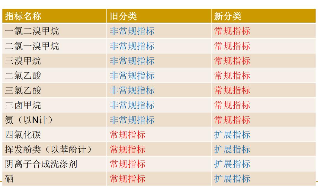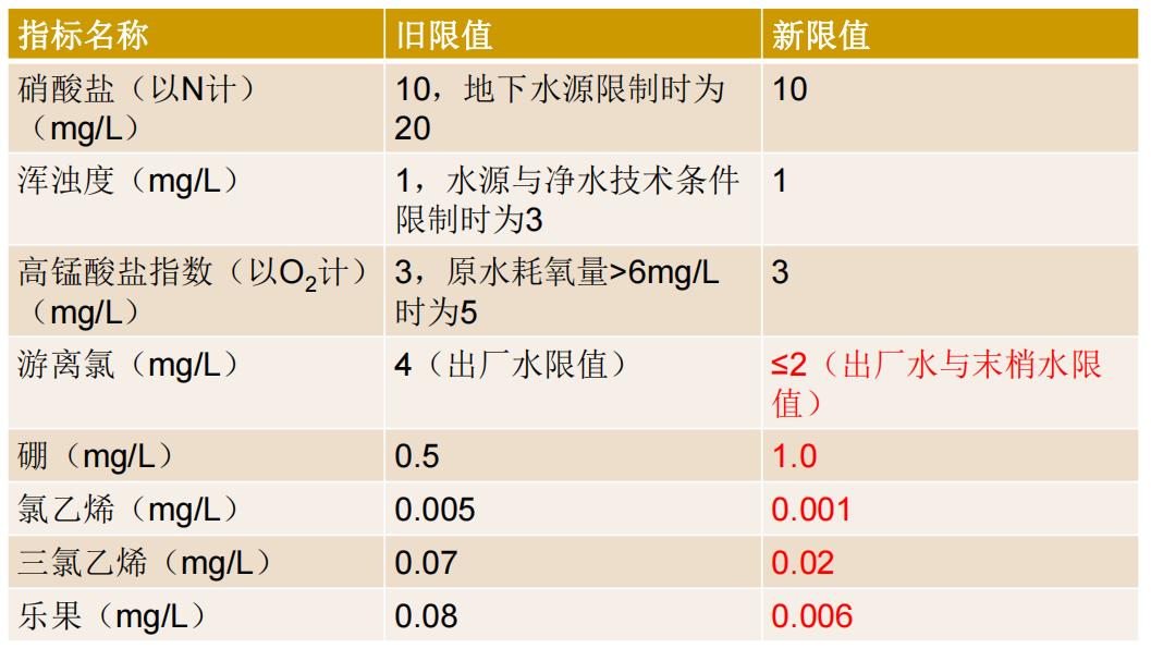 本次修訂的主要技術變化是水質指標由舊版的106項調整為97項,其中增加了4項、刪除了13項、更改了3項指標的名稱以及更改了8項指標的限值。新增的4項指標均為擴展指標,乙草胺、高氯酸鹽、2-甲基異茨醇(2-MIB)和土臭素。